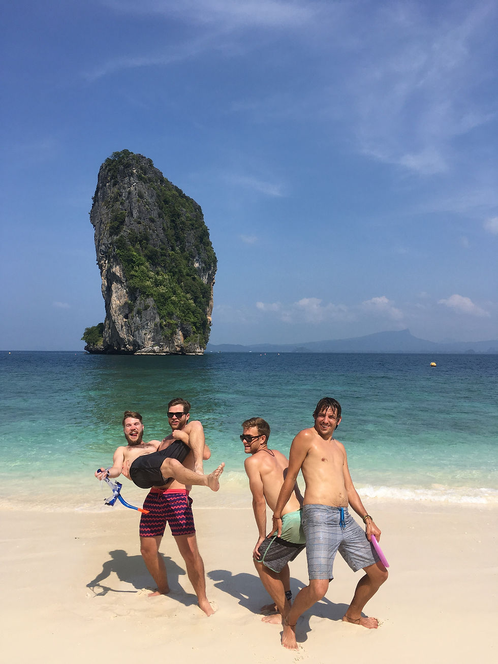 Hello fellow readers of Ben and Meg’s Travel Bugs Blog. Andrew Wiech here, one of our newlywed’s friends from Milwaukee. Before I make you read my ramblings of what we did in Ao Nang & Krabi, I should probably share some credentials. I’m a Milwaukee Bar League volleyball teammate for team Crazy Aunt Mikki and really started hanging out with Ben and Meg probably because they needed a sub. Our mutual friend Dan typically subbed in from time to time but he had tore his Achilles and was out of the season so I got the text to come and play. Shortly after Dan’s injury, Taylor busted up his ACL in a REC soccer game and they needed a full-time third guy. Given my speedy replies to texts and my typical willingness to say yes, I joined. Obviously, I don’t wish injuries on my buddies but in this particular scenario, it kind of worked out in my favor.