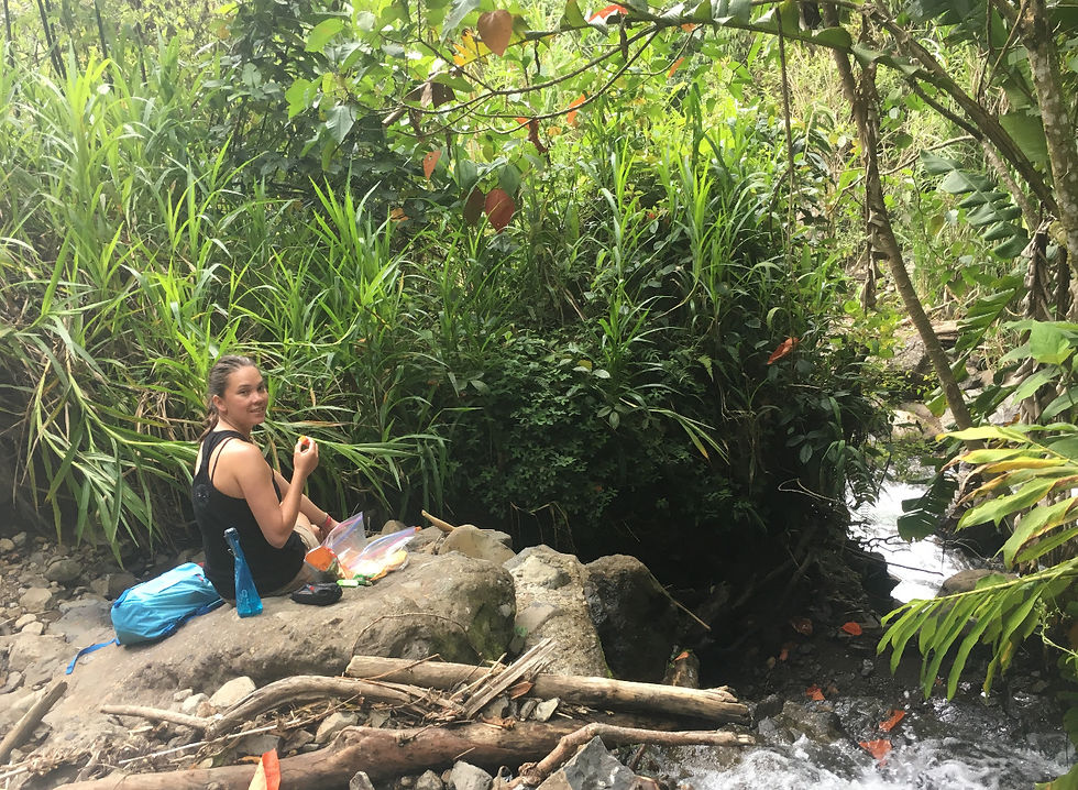 - we didn't get lost! It took us on a dirt path southeast of town then you turn off in between these two properties and follow along a path with coffee trees on your right and big banana trees on your left. Then you cross the river on a rickety bridge and then go up through more banana fields for awhile. The first stop was a great little area further up the river where there was a big ole pile of rocks to climb on. We sat for awhile, took some pics, ate lunch. Next stop was another waterfall/swimming hole called charco corazon. We became fast friends with a very adventurous doggo who followed us as we explored further down the river for awhile. He eventually returned to his owner but he sure was a good boy. We would've named him Dino (as in Jar-Dino). We looped back into town and both agreed that this hike was one of our favorites on the trip so far.